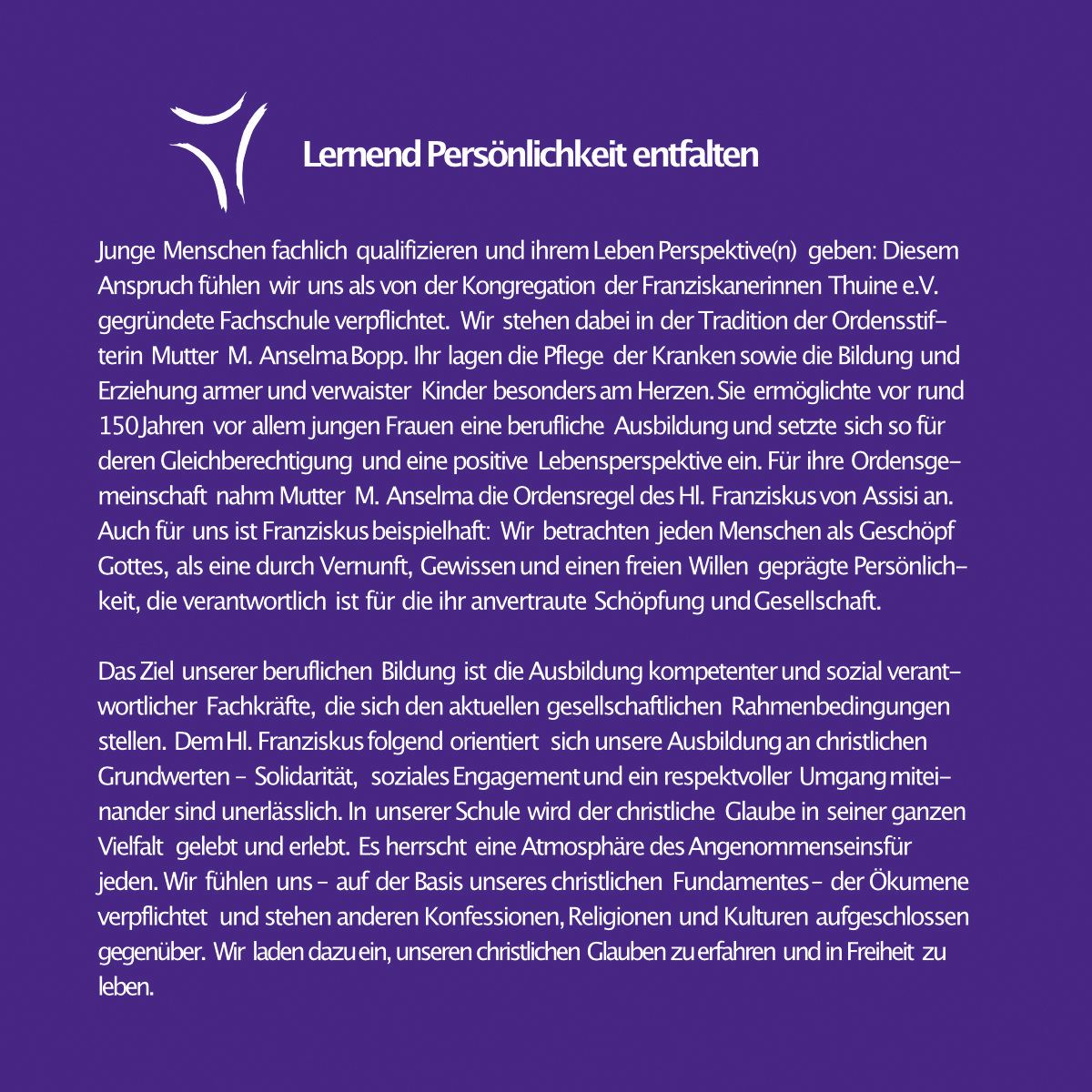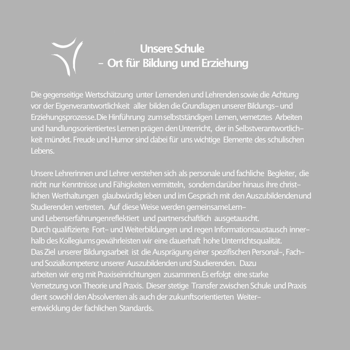 Ihr Leitwort "Dem Leben Perspektive(n) geben" gilt sowohl den Auszubildenden, die hier ihre beruflichen Perspektiven ausloten als auch den Menschen, mit denen Erziehende arbeiten - den Kindern und Jugendlichen, ihren Eltern und Familien, der Gesellschaft insgesamt.